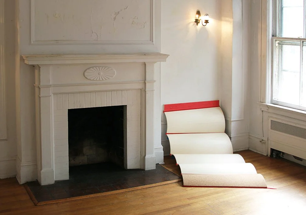 Empty room with white fireplace, wooden floor, a single wall lamp, and an open window, featuring an artistic bookshelf resembling an open book leaning against the wall.